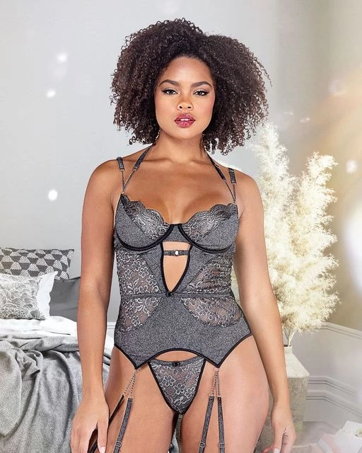 Shimmy into this little number and prepare to break some hearts! This outfit is crafted in two luxe fabrics, a steely colored shimmering lace and a black fabric with shine woven throughout. An underwire ensures that your bust will look it’s best and offer plenty of support. Double straps are accessorized with chain details for a cool and modern look, and the midriff features sheer lace panels and a center cutout, that lead down to a matching chain garter belt. A sheer black mesh back adds a sultry charm. Pair with a skimpy matching lace thong for a look that can’t be beat!