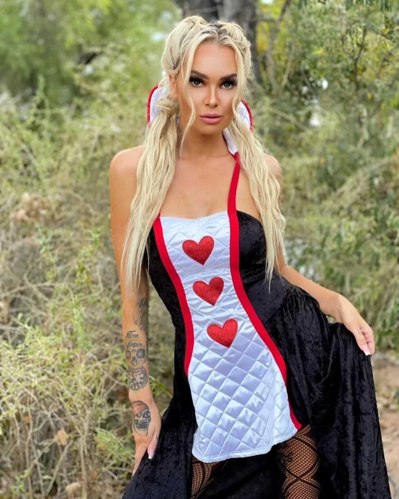 Off with their heads! Hold court in this costume that features a quilted mini dress in black, white and red with three red hearts down the center. The sweetheart neckline will guarantee total obedience from your royal subjects, and the gown has a mini length in the front that showcases some leg and maxi length in the back that shows you mean business. The matching white and red quilted attached high collar brings some flair and drama to the ensemble and makes sure that all eyes are on you! It can be worn up or down depending on your mood. Top it all off with the perfect royal accessory, a black crown to cement your status as the ruler of the realm.