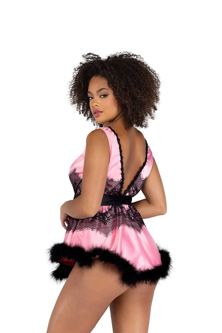 2PC Satin and Lace Babydoll with Tie and Faux Feather Detail