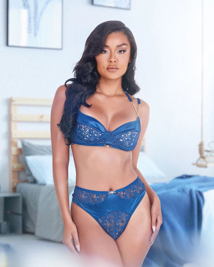 A classic set with a twist, this Satin and Lace Bralette Set brings your lingerie collection up to speed for who you really are: stylish and sexy all at once. In a demure navy with gold chain accents, this set spells “class” in the details.