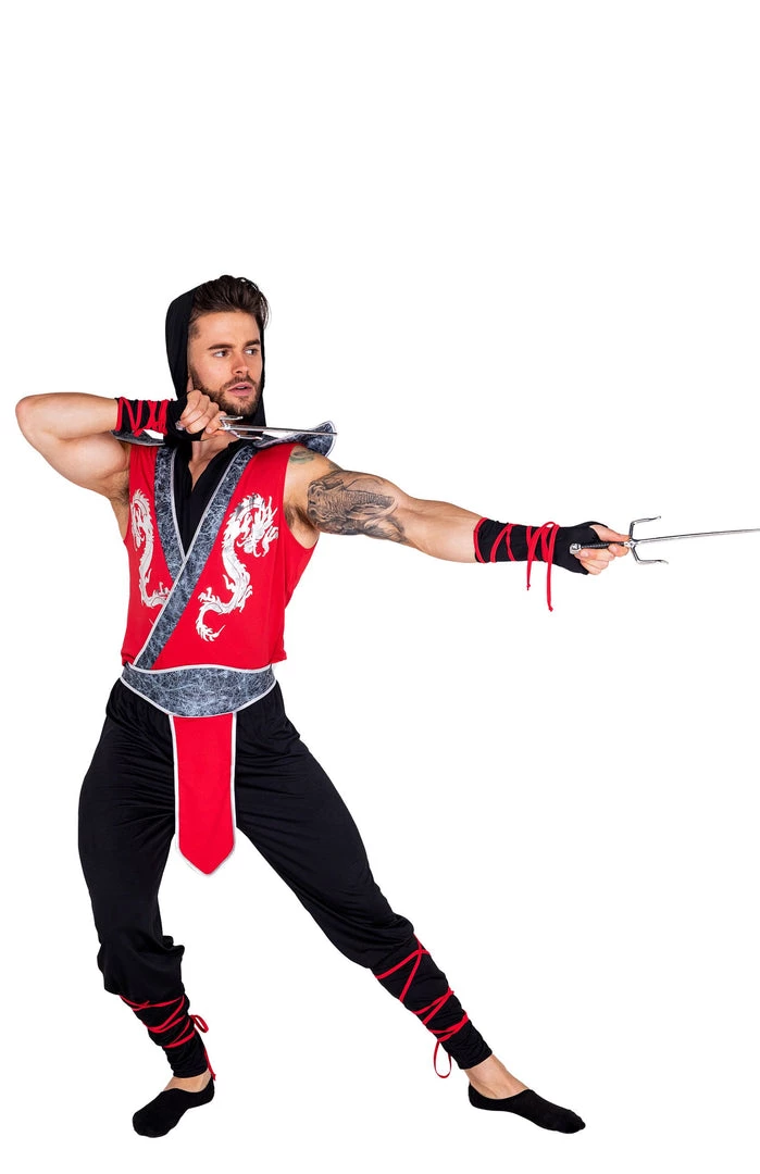 Rock the bad boy look and embrace your inner action star with this costume that features a very cool and unique hooded shirt in a regal red tone. With itβs wrap styling and gorgeous gold dragon appliques, this top has a traditional appeal and will stand out from the crowd. Contrasting grey trim leads to dramatic shoulders that accentuate your manly physique. Pair with the comfortable black pegged pants that are finished with lace up leg warmers in a matching red shade. Add the waist panel and coordinated lace up arm cuffs for a head to toe look that is sure to turn some heads.