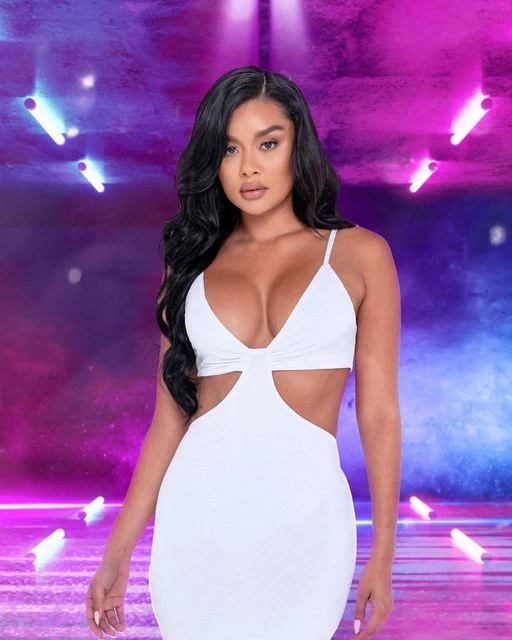 A narrow piece of fabric connects to the bikini-style top just between your breasts, then flares elegantly outward into a skin-tight skirt that hugs your every curve. This unique style leaves sexy cutouts on your sides that wrap around your back, showing off plenty of skin for your admirers to enjoy.