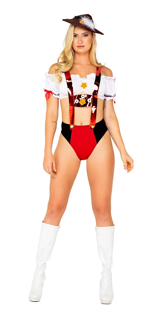 Includes: Off the Shoulder Top, Shorts with Attached Lederhosen and Hat