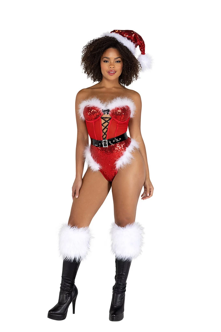 The holiday season is the perfect time to spice up your private life, and this romper is just what you need to achieve that. Surprise your partner with our Sequin and Mesh Lace-Up Romper with Faux Fur Trim Detail and Vinyl Belt with Faux Diamond Buckle this Christmas season. Our sequin and mesh lace-up romper is cute, sexy, and comfortable. This romper comes with a sequin hat that features faux fur trim around the romper and bra cup and a black vinyl belt detail with faux diamond on the buckle.