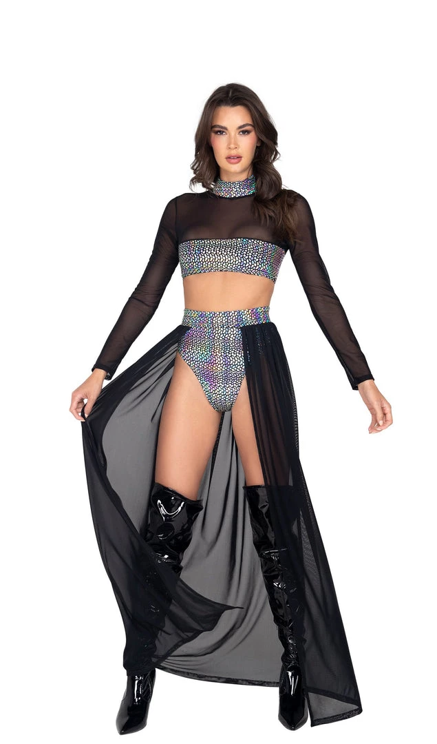 Sometimes it’s all about the accessories. Add a little something extra to your look with a skirt that’s long on fabric as well as style! This open long sheer skirt with waisted band is a great way to add a bit of coverage to your favorite ensemble. A little bit futuristic, this skirt will have you feeling like a caped crusader.