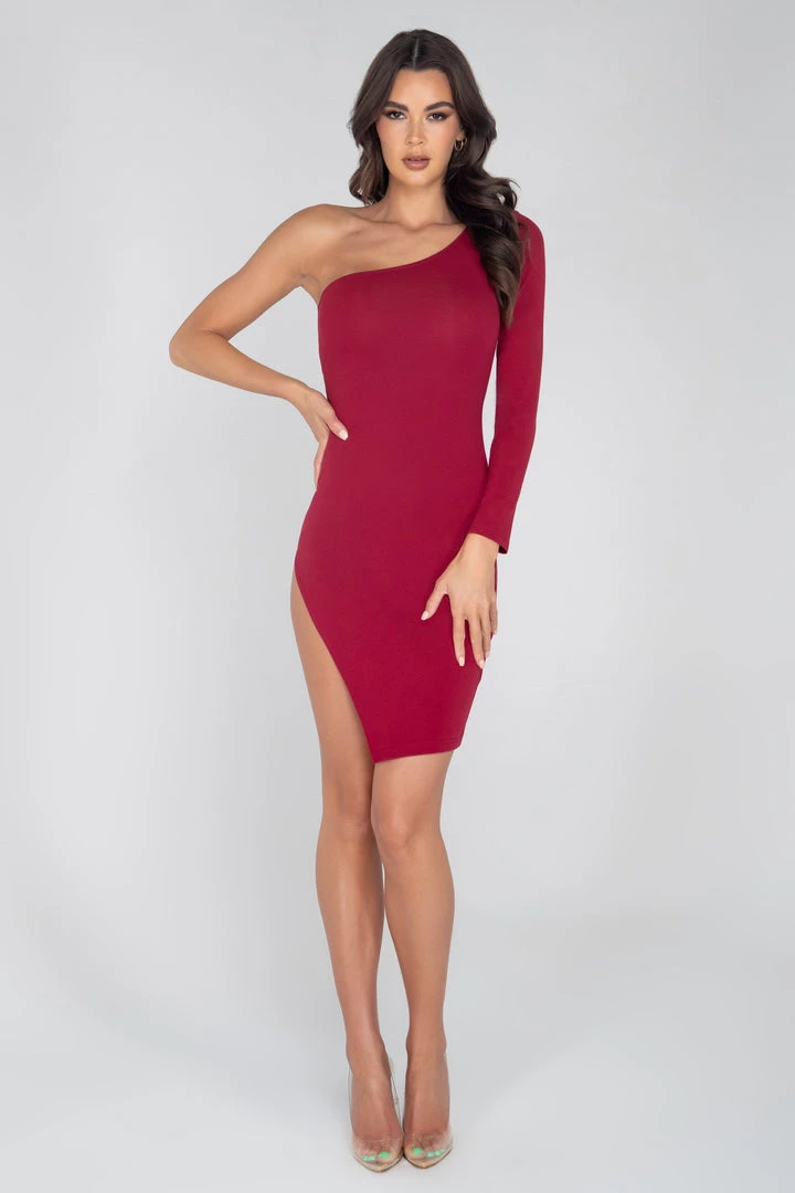 A fantastic wardrobe addition, this fashionable and cool dress is a great selection for all kinds of occasions. Look chic on a hot date, out for cocktails with the gals, or at a party. Turn up the heat with this dress which features a unique one shoulder design and long sleeve that emphasizes your decollate. With a closely-fitted design, this look hugs each and every curve.Β A midi length keeps it classy, but a daring and high split exposes an enticing swarth of thigh. They wonβt be able to look away from the tease of flesh! Available in two versatile colors, classic black or a rich and sexy Burgundy.