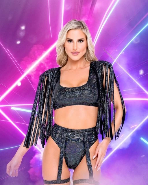 Worried about a black top making you disappear into the crowd at a rave? Don’t be! The black material has an eye-catching shimmer in every color of the rainbow, so when those lights hit you, you’ll be sure to draw every eye on the dance floor. Our Shimmer Crop Top with Fringe Detail pairs beautifully with our Shimmer High-Waisted Shorts & Garter Belt for a sexy look that’s completely irresistible and a level of flair that will have you oozing confidence at your next rave. This top is available in sizes S, M, and L and comes in black.